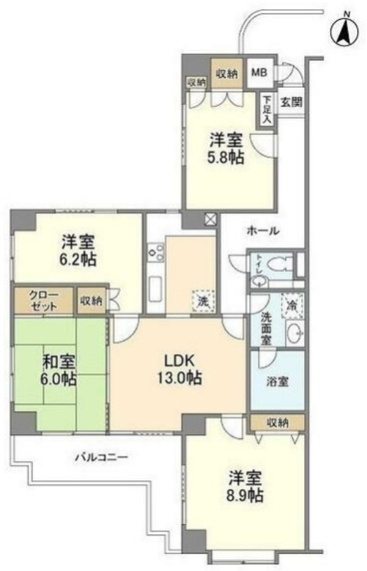 | 間取り詳細 | 洋室 8.9畳 、 洋室 6.2畳 、 洋室 5.8畳 、 和室 6畳 、 LDK 13畳 |