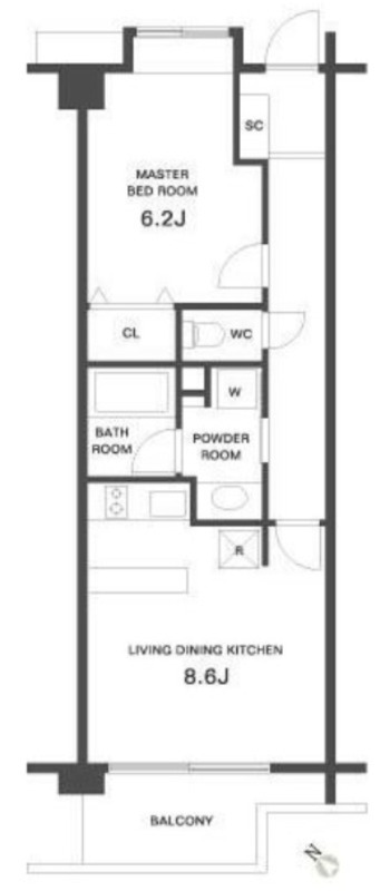 | 間取り詳細 | 洋室 6.2畳 、 LDK 8.6畳 |