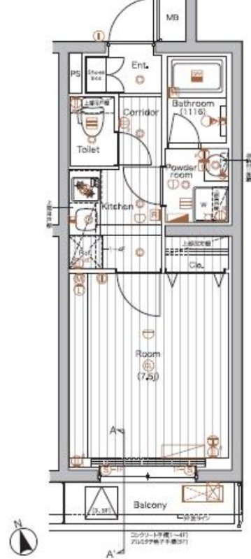 洋室 7.5畳 、 K 畳