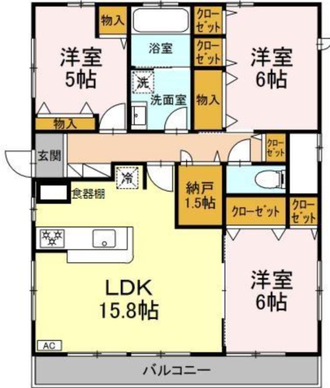 | 間取り詳細 | 洋室 6畳 、 洋室 6畳 、 洋室 5畳 、 LDK 15.8畳 、 S 1.5畳 |