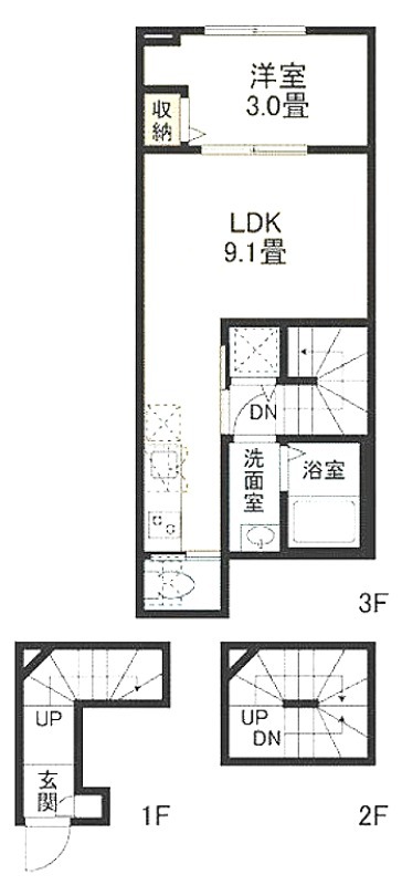 洋室 3畳 、 LDK 9.1畳