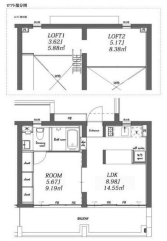 | 設備 | ガス(都市ガス)、24時間緊急対応、インターホン(TVモニター付き)、ディンプルキー、ダブルロック、オートロック、宅配ボックス、専用ゴミ置き場(24Hゴミ出し可)、駐輪場、日当り良好、デザイナーズ、通風良好、フローリング、全居室フローリング、ロフト、ベランダ・バルコニー、クローゼット、クローゼット数(3)、全居室収納、下駄箱、バス・トイレ別(別室)、シャワー、浴室乾燥機、脱衣所、温水洗浄便座、洗面所独立、洗面所にドア、洗濯機置き場(室内)、コンロ口数(2)、コンロ種類(都市ガス)、システムキッチン、エアコン、エアコン台数(2)、24H換気システム、BS、CS、CATV、光ファイバー、インターネット使用料無料 | ||