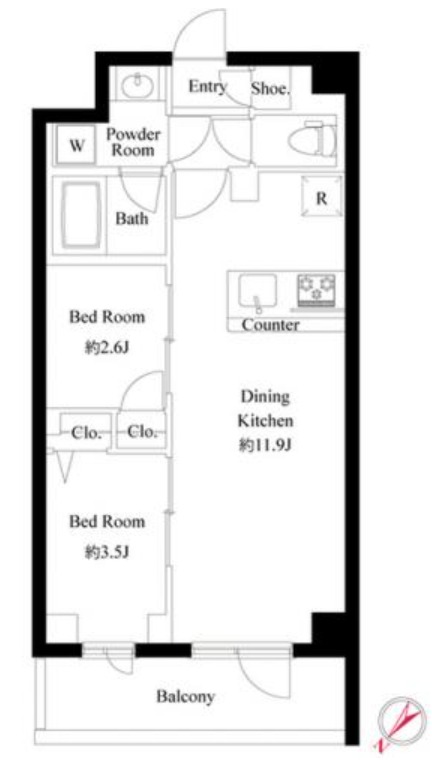 | 間取り詳細 | 洋室 3.5畳 、 洋室 2.6畳 、 LDK 11.9畳 |