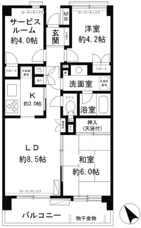 | 間取り詳細 | 洋室 4.2畳 、 和室 6畳 、 LDK 11.5畳 、 S 4畳 |