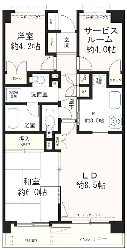 | 間取り詳細 | 洋室 4.2畳 、 和室 6畳 、 LDK 11.5畳 、 S 4畳 |