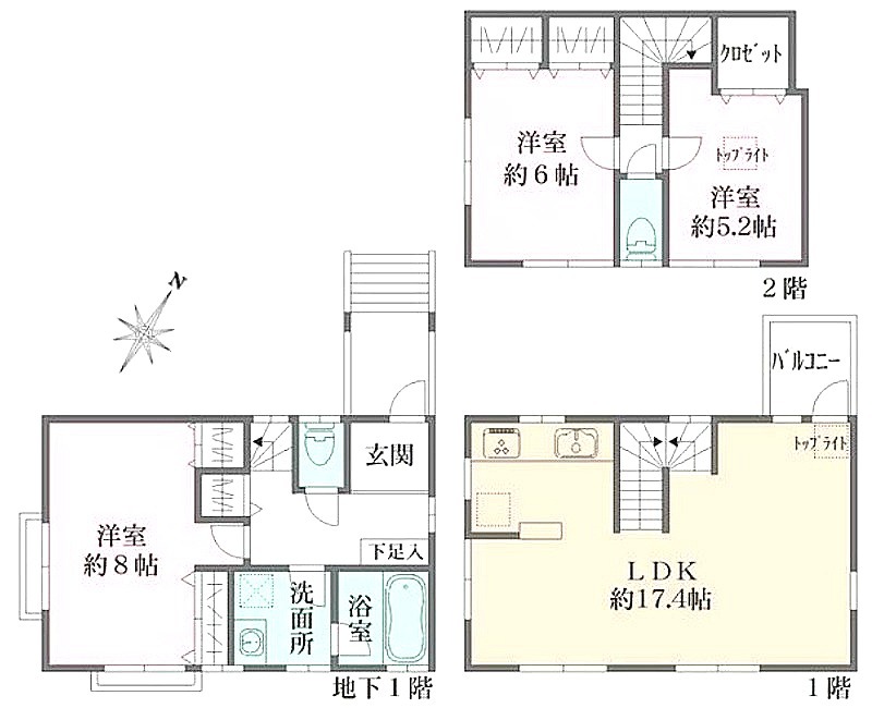 | 間取り詳細 | 洋室 8畳 、 洋室 6畳 、 洋室 5.2畳 、 LDK 17.4畳 |