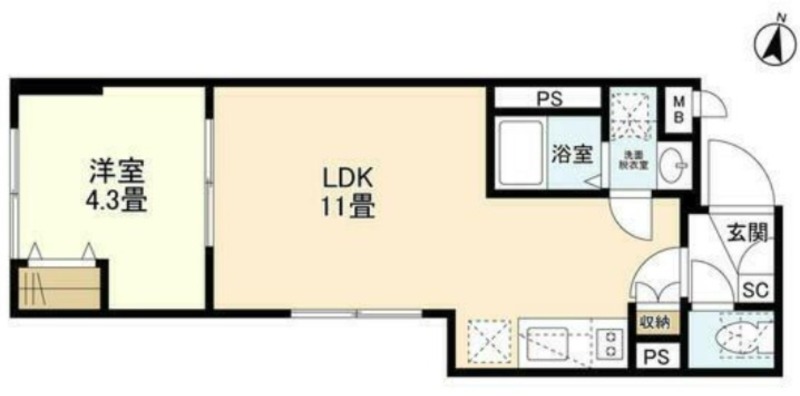 洋室 4.3畳 、 LDK 11畳