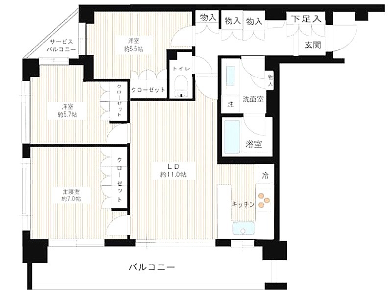 | 間取り詳細 | 洋室 7畳 、 洋室 5.7畳 、 洋室 5.5畳 、 LD 11畳 、 K 畳 |