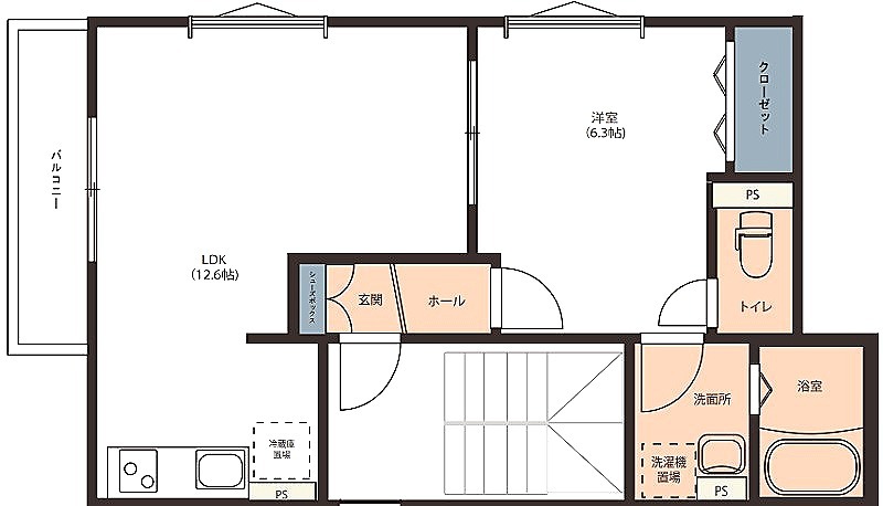 洋室 6.3畳 、 LDK 12.6畳