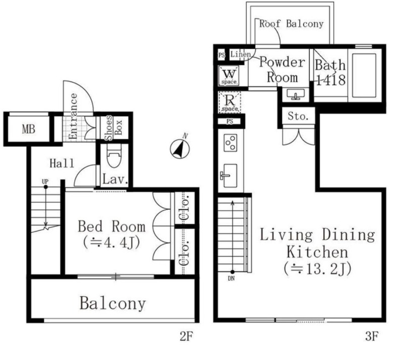 洋室 4.4畳 、 LDK 13.2畳