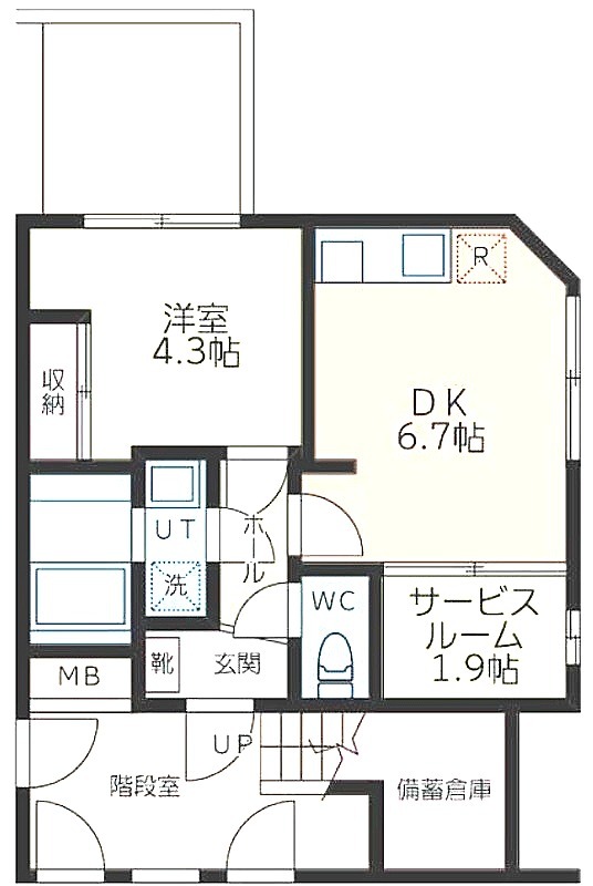 | 間取り詳細 | 洋室 4.3畳 、 DK 6.7畳 、 S 1.9畳 |