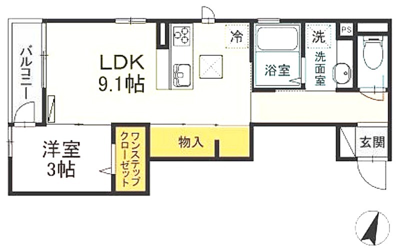洋室 3畳 、 LDK 9.1畳