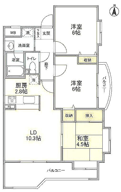 | 間取り詳細 | 洋室 6畳 、 洋室 6畳 、 和室 4.5畳 、 LDK 13.1畳 |