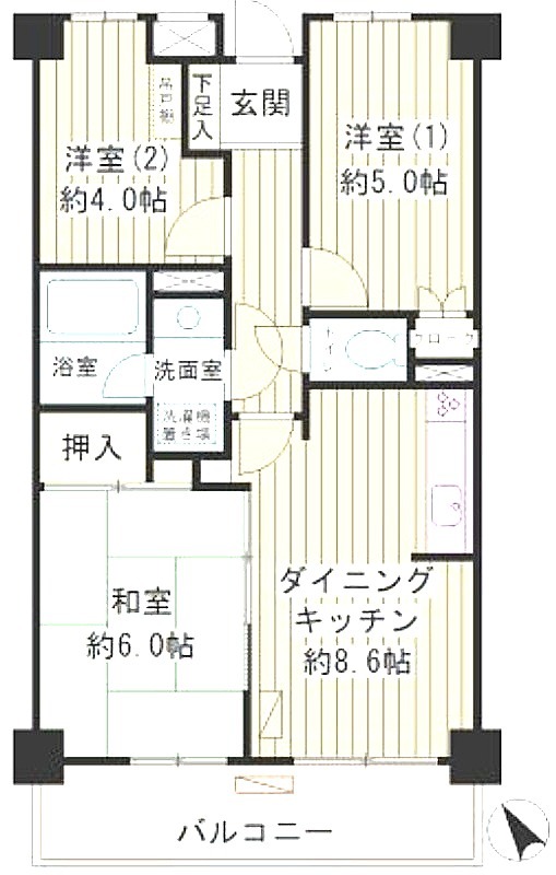 | 間取り詳細 | 洋室 5畳 、 洋室 4畳 、 和室 6畳 、 DK 8.6畳 |