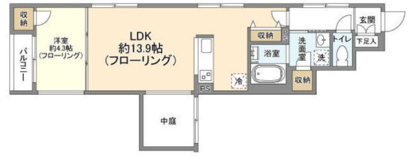 | 間取り詳細 | 洋室 4.3畳 、 LDK 13.9畳 |